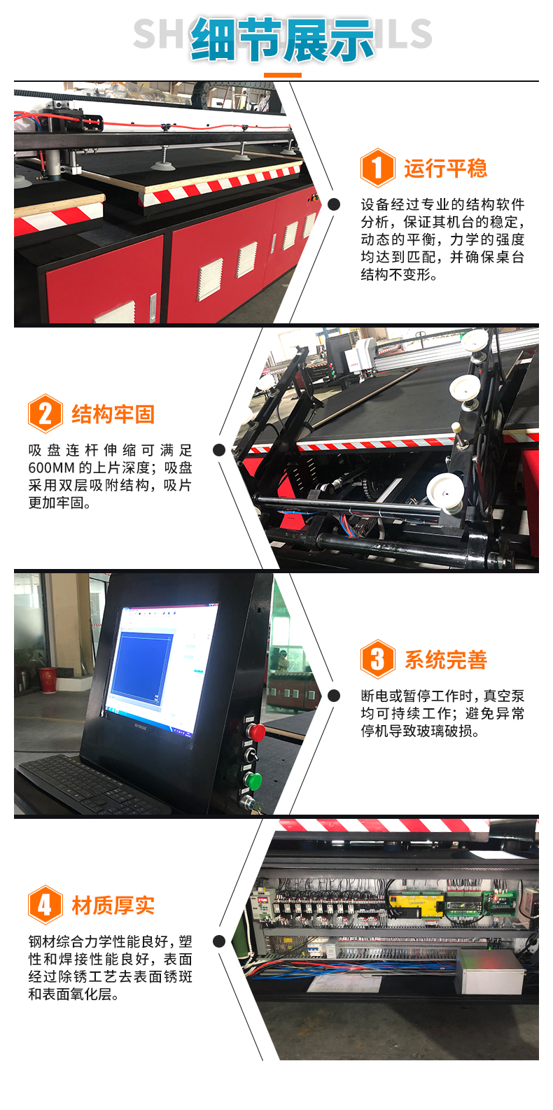 操作系統(tǒng)簡(jiǎn)介:l 、運(yùn)行速度快,運(yùn)行平穩(wěn),控制精度高,控制器結(jié)構(gòu)模塊化; 2 、流水線切割模式、光電定位切割模式、直接切割模式通過選項(xiàng)自由設(shè)置。 3 、加工路徑實(shí)時(shí)跟蹤顯示,警自動(dòng)記錄。適時(shí)記錄運(yùn)動(dòng)坐標(biāo),軸狀態(tài), ! / 0 狀態(tài),故障診斷與報(bào) 4 、下刀距離可設(shè)。編輯加工文件時(shí)可以不用修邊,提高玻璃利用率。 5 、 OX 「類文件的排序功能,有近點(diǎn)、切入點(diǎn),或按圖形顏色順時(shí)針、逆時(shí)針排序等選項(xiàng)。自由實(shí)現(xiàn)單相切割與雙向切割切換。 6 、圖庫(kù)套料編程,從圖庫(kù)中選取異形,設(shè)置相關(guān)參數(shù)、加工數(shù)量,自動(dòng)套料,生成加工軌跡。了、補(bǔ)償功能:刀具偏心補(bǔ)償、間隙補(bǔ)償、螺距補(bǔ)償。 8 、光電定位功能(確定玻璃的實(shí)際位置)切割。根據(jù)實(shí)際位置和偏轉(zhuǎn)角度,自動(dòng)調(diào)整 9 、各種保護(hù):包括軟硬限位、刀壓限制、外部急??刂频鹊?。、速度增加/降低按鈕可適時(shí)優(yōu)化機(jī)器切割速度。、人機(jī)界面簡(jiǎn)潔大方,參數(shù)調(diào)整簡(jiǎn)單,需要操作人員修改的參數(shù)較少,簡(jiǎn)單直觀,對(duì)操作人員要求低。、主機(jī)采用一體機(jī)模式,穩(wěn)定性高